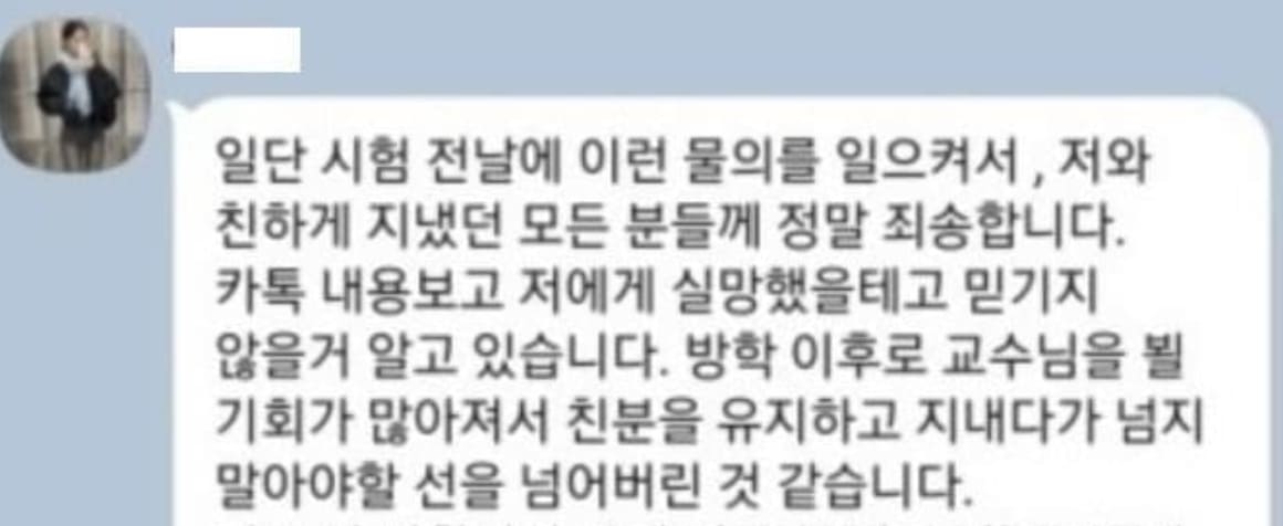 B양은 "일단 시험 전날에 이런 물의를 일으켜서, 저와 친하게 지냈던 모든 분들에게 정말 죄송하다"라며 입을 열었습니다.